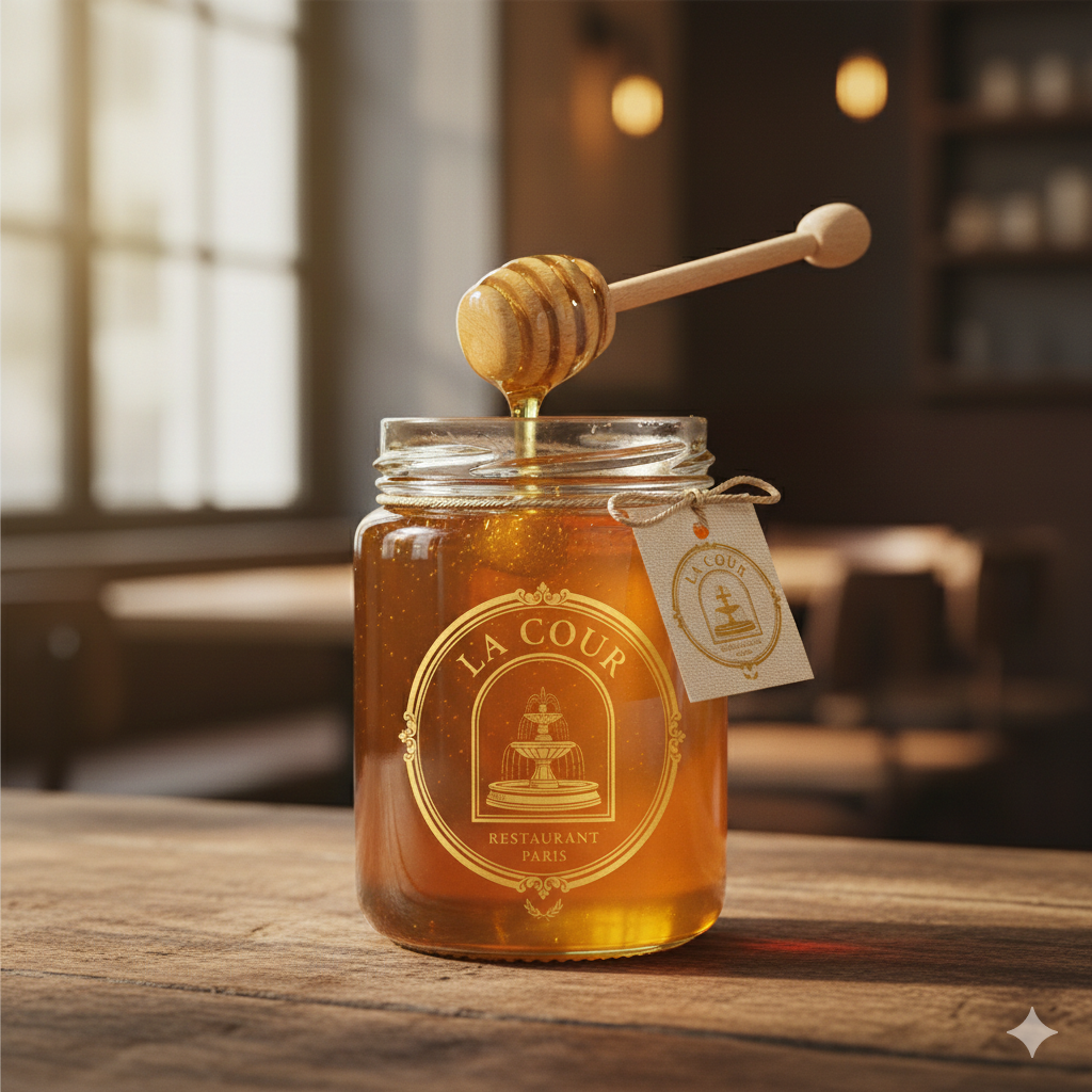 Sérigraphie Artisanale : Notre logo iconique, la fontaine de La Cour, est imprimé avec des encres végétales dans un vert forêt profond.